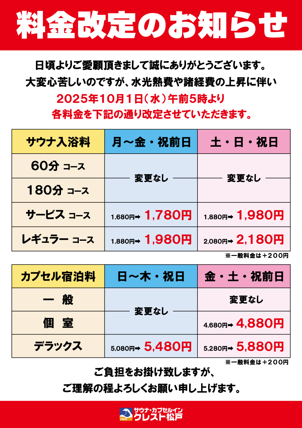10/1(水)より以下の通り料金を改定させて頂きます。ご理解の程よろしくお願い申し上げます。